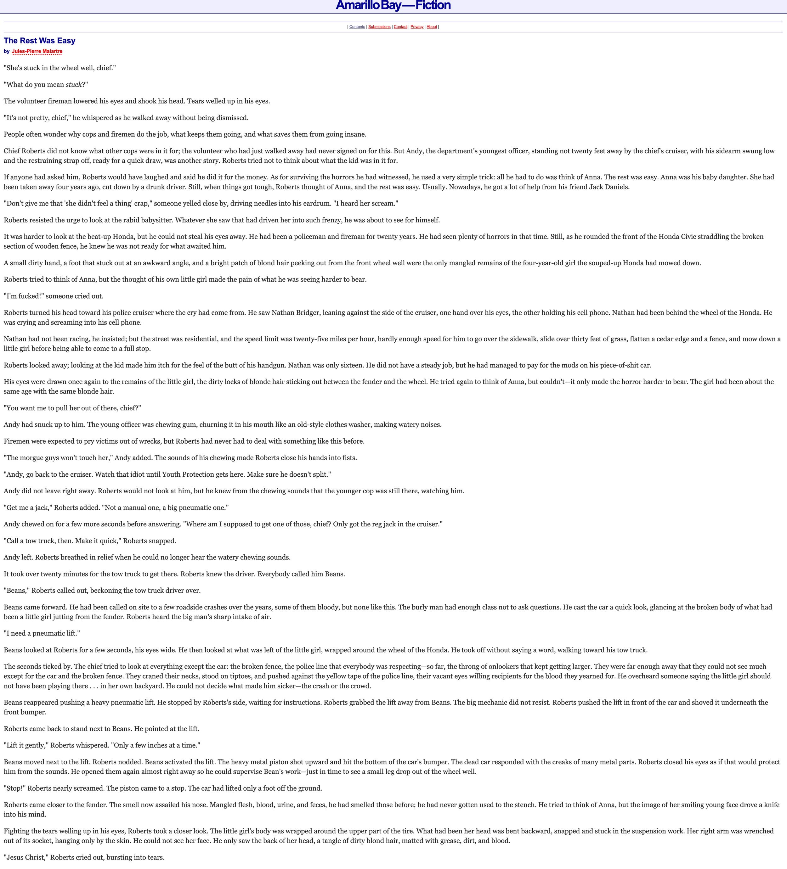 A few years ago, the neighborhood where I grew up was changed forever following the gruesome death of a toddler during a street racing incident. A teenager lost control of his car. Even though he insisted he was not speeding, the car jumped over the boardwalk, slid over several feet of grass, crashed through a cedar edge and came to a full stop only after mowing down a four-year-old little girl who was putting up Halloween decorations in her yard. The local rumors that circulated said that it took hours to extricate the little girl’s body from the car wreck. I tried to picture that intervention in my mind. In the end, I ended up writing a fictitious account of that intervention. This short story was written to increase awareness of street racing in small suburbs. It was published by the Amarillo Bay literary magazine. (Warning! Graphic Content!)